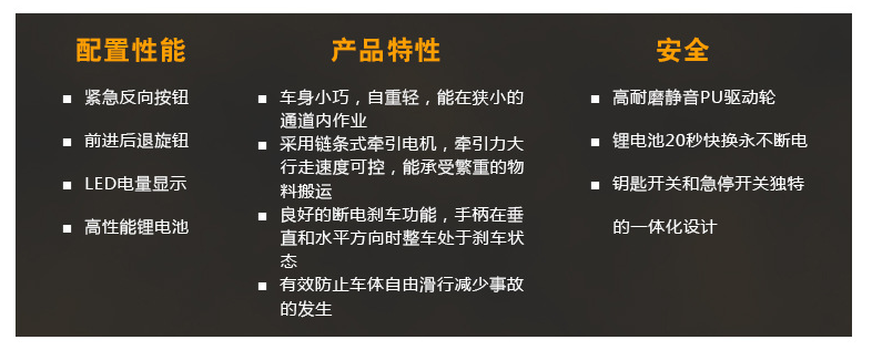 采用進口驅動輪,配置可靠的盤式剎車系統,動力強勁,操控自如,配有大容量的高效能電池,電量持久,帶電量顯示表,低電壓報警燈,采用重型設計,結構緊湊,操作視野開闊。